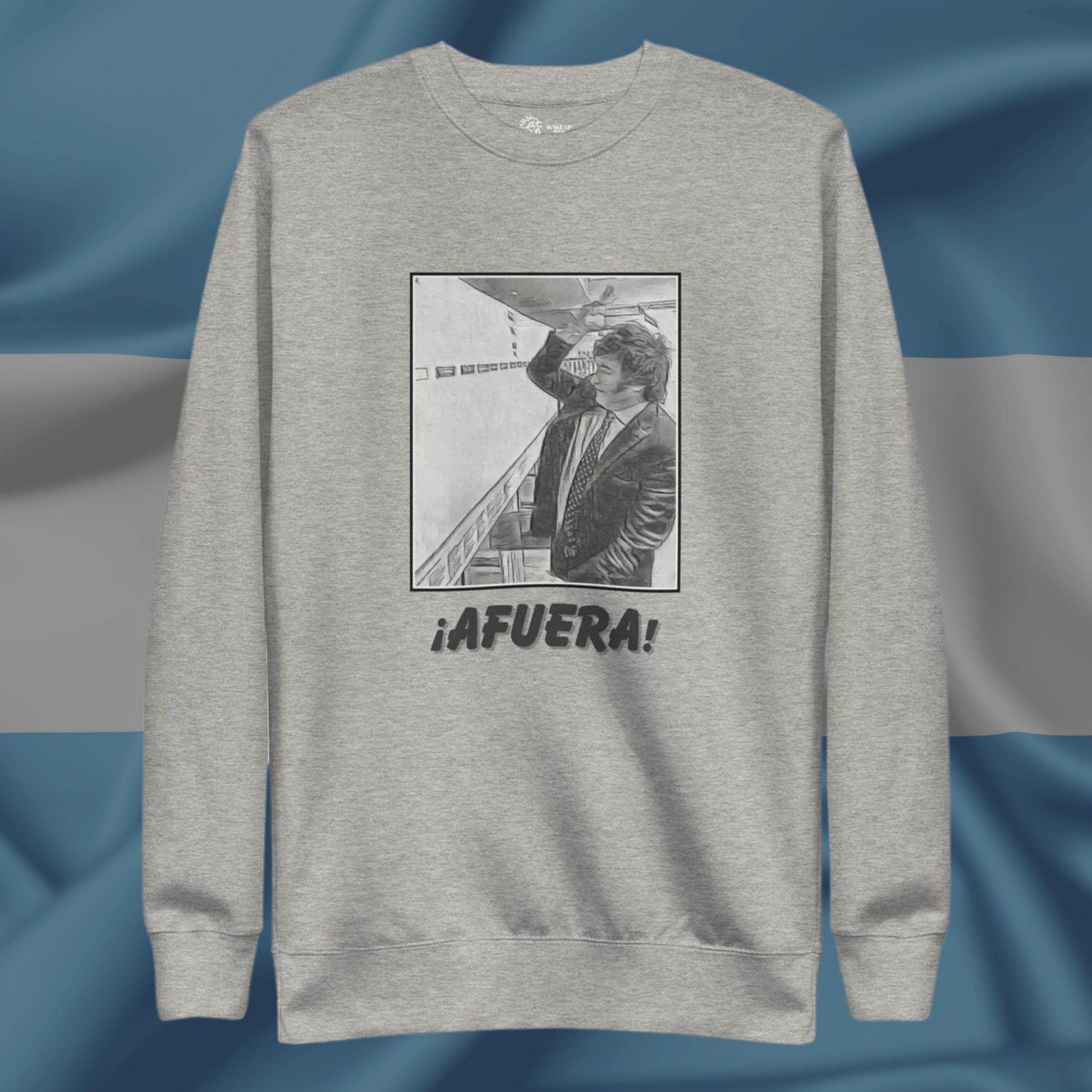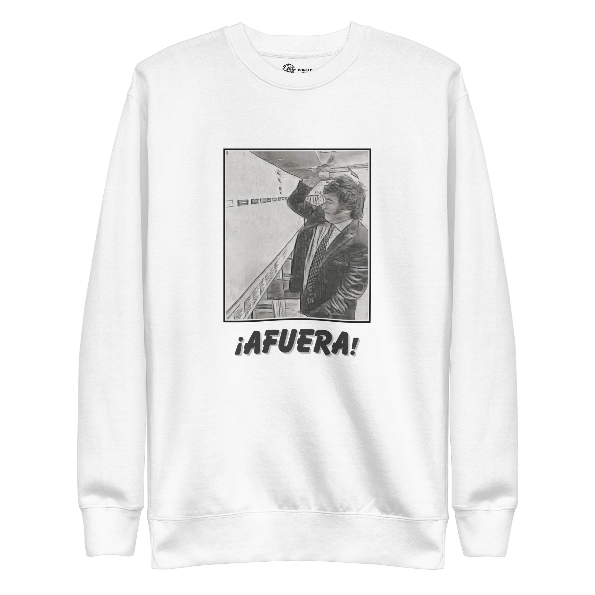 This design depicts a viral video of the President of Argentina, Javier Milei, as he rips the names of Argentina government ministries off of a whiteboard whilst exclaiming 'AFUERA!' for each one (afuera means 'out' in Spanish). As part of his plan to reduce unnecessary governmental spending, President Milei followed through on his messaging and cut the number of Argentina government ministries in half shortly after taking office.